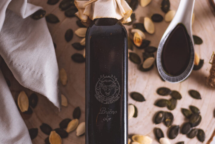 Domače bučno olje in jabolčni kis v lesenem namiznem pakiranju