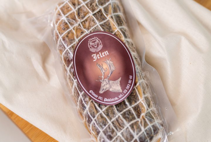 sestavine: Jelenje meso, svinjsko meso, svinjska maščoba, česen, vezivo, sol, poper.