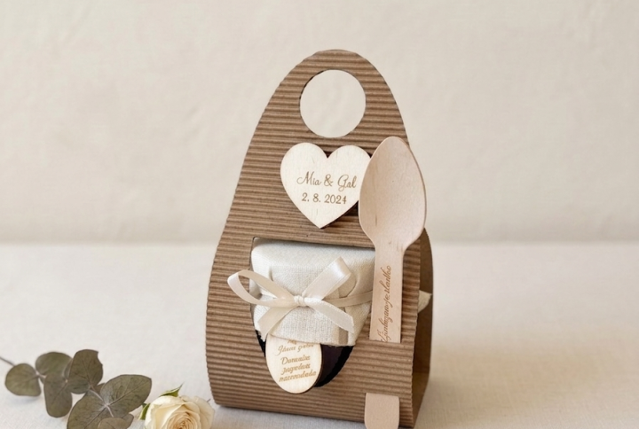 Akacijev med z leseno ovijalko in personalizirano gravuro vajinih imen in datuma poroke.